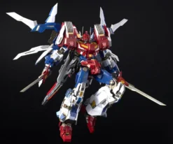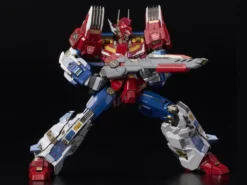 From Flame Toys, Star Saber is the fourth figure in the Kuro Kara Kuri line. This non-transforming figure is based the character’s design as seen in the comics. Star Saber features a detachable face mask as well as diecast parts for solidity and heaviness. Weapon accessories include 2 small swords, a big sword, shield, and 2 small busters can be combined to be a big buster!