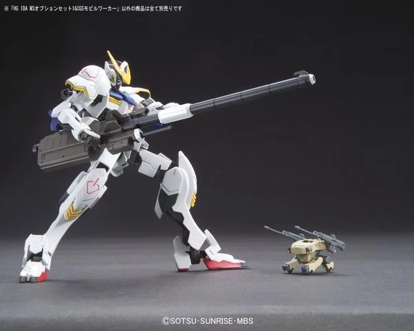 This set includes weapons and accessories to be used with the HG Gundam Iron-Blood Orphans model kits or other HG style kits. The set features a long range artillery rifle, a lance and shield, as well as a mobile worker.