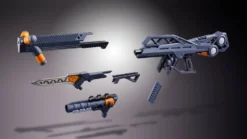 The set includes four pairs of optional hands, a Progressive Knife, a Magoroku Exterminate Sword, a Pallet Rifle, a handgun, a Pallet knife full option, an umbilical cable, a mounting joint, an optional head with goggles, shin armor, a support rod, and a display stand with cage.