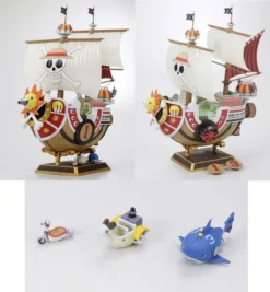 From the anime series One Piece, this model kit features the Thousand Sunny and includes minifigures of Luffy and other pirates. The kit also includes three mini ship figures: Shiromokuba, Mini Merry and Shark Submerge. The finished model kit will stand approximately 11 inches (27.94cm) tall.