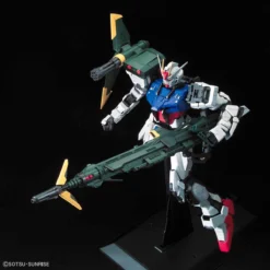 The set features newly molded parts for the armor throughout the body, like the head and face, to give the Strike Gundam a brand new apperarance, along with updated gunmetal coloring, an internal frame, and a darker shade of blue on the armor. Strike Gundam also features plated parts to highlight frame components and LED light-up eyes.