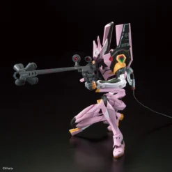 The RG Evangelion features intricate linked parts construction to represent the relaxation and contraction of muscle fibers resulting in a very close emulation of human-joints. The movement of the spine and shoulder blades are linked to the armor parts and follow the movement of the arms and chest, shifting as needed to prevent parts from obstructing each other. From this, realistic humanoid crouching and weapon holding poses are possible. Its characteristic, the ultra-long-distance is included along with Pallet Rifle, 2 Progressive Knives, Umbilical Cable, and 6 types of hands in different expressions.